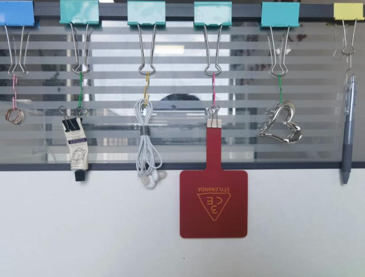 把燕尾夹固定在围挡上,可以用来收纳办公室一些小物件儿。