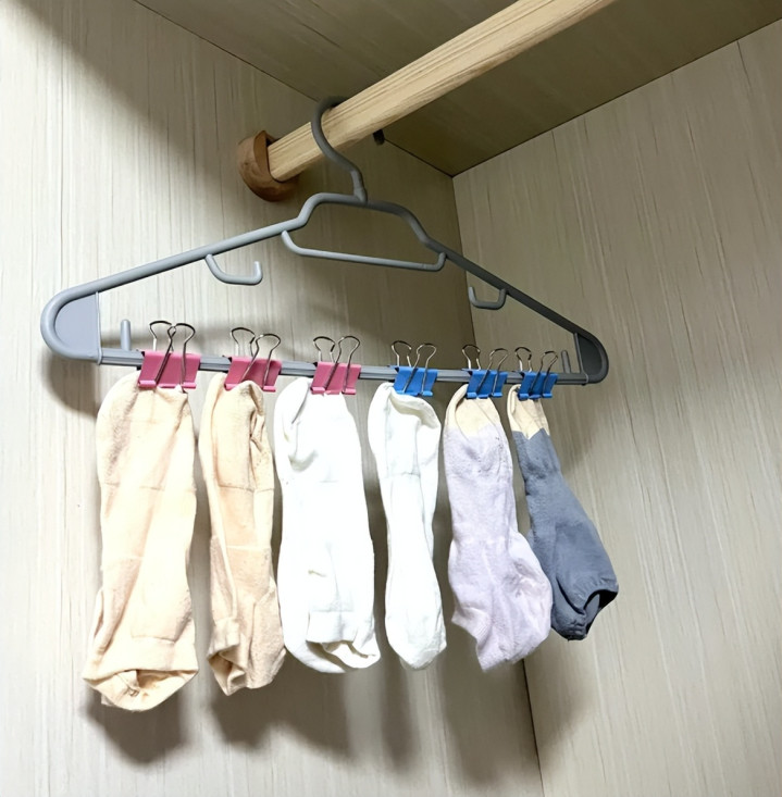 平时穿的袜子,也可以用燕尾夹全都夹在衣架上,这样一个衣架可以收纳好几双袜子。