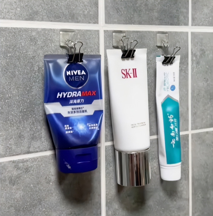 这些洗护产品用燕尾夹夹住,可以悬空收纳,干净又卫生,这样就不用担心放在明面上乱糟糟的了,而且还可以利用墙面空间。