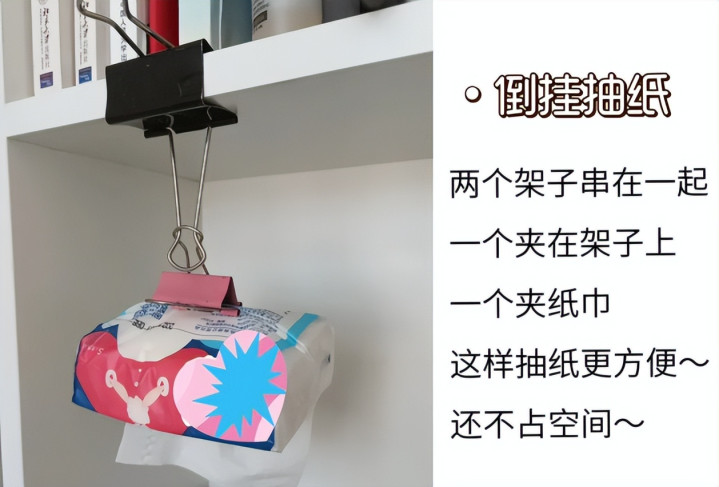 平时抽纸巾比较麻烦的话,可以准备一个燕尾夹,直接把燕尾夹夹在柜子层板上。