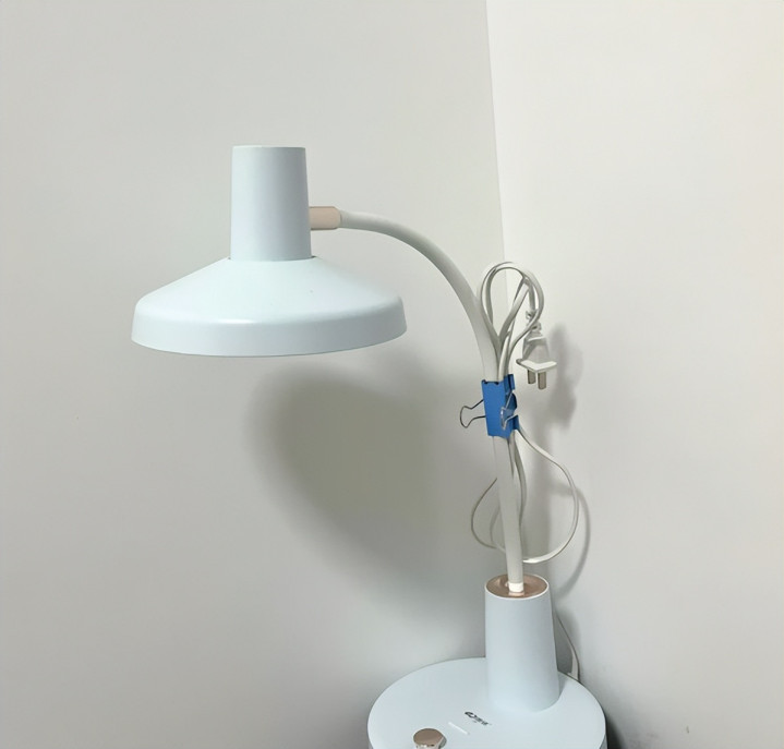 除了数据线之外,像是家里的台灯,台灯先也可以用燕尾夹收纳,台灯线折叠起来,用燕尾夹夹起来,固定在台灯上,收纳效果特别好。