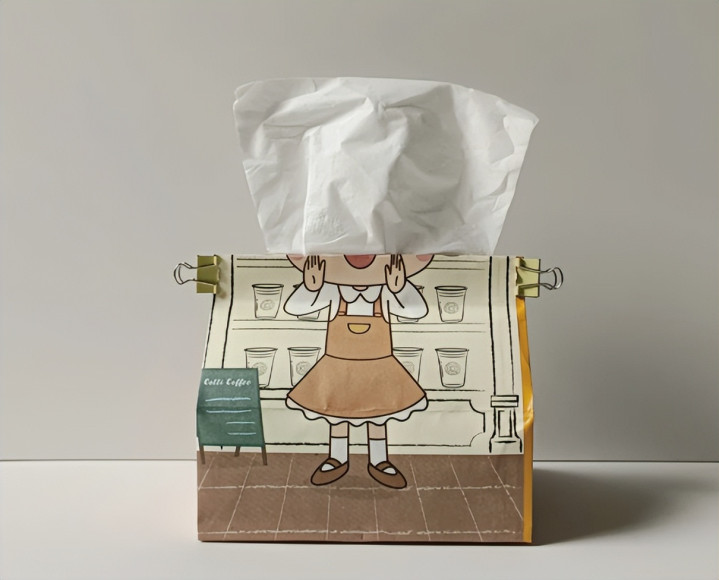 把奶茶袋子底部留着,把纸抽放进奶茶袋子里面,搭配着两个燕尾夹,把燕尾夹夹在两边。