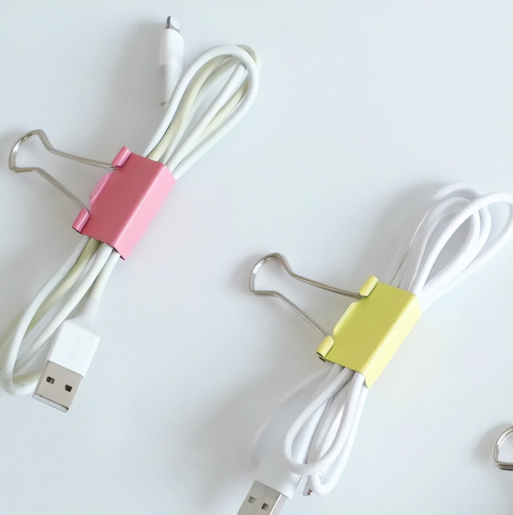 多余的充电器线也好、耳机也好,折几下用燕尾夹直接夹起来,家里这些数据线、耳机,都可以用燕尾夹夹好。