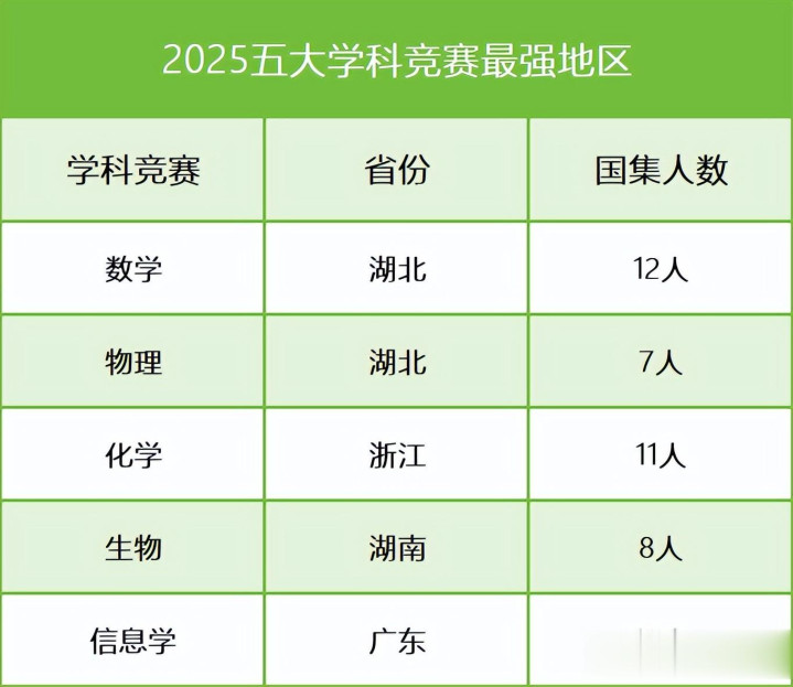 值得一提的是,今年湖北堪称数学、物理赛道的“黑马”:数学以12人、物理以7人拿下单科第一,尤其数学比去年(9人)涨了3人,物理也比去年稳步提升,单科爆发力十足。但遗憾点也很突出——生物学、信息学今年颗粒无收,直接导致总人数仅20人(位列第七),学科发展的不均衡拖了后腿,期待明年能补齐短板。