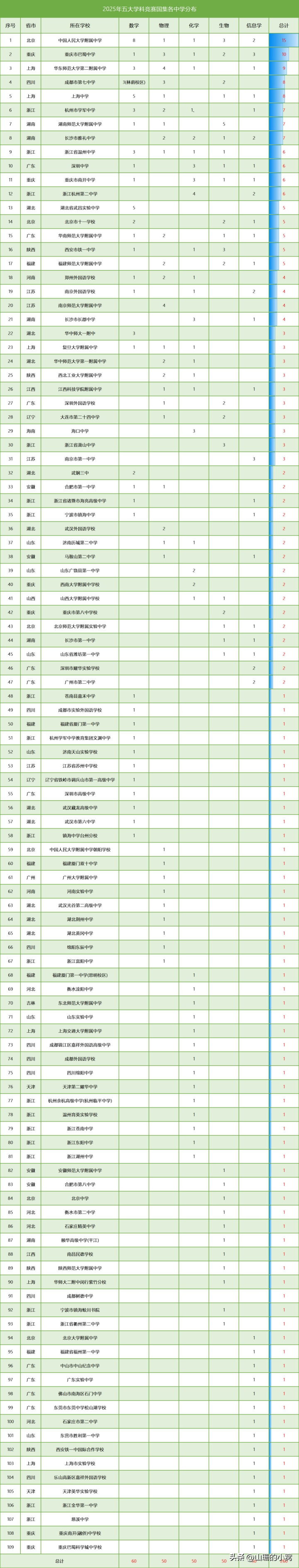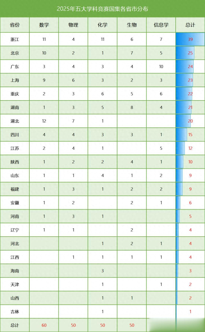 与此同时,北京(25人)、广东(24人)表现格外亮眼:北京靠数学10人、生物学7人的优势冲上第二,广东则凭信息学10人的“爆点”稳居第三;上海(23人)、重庆(22人)紧随其后,前五强的竞争比往年更胶着。
