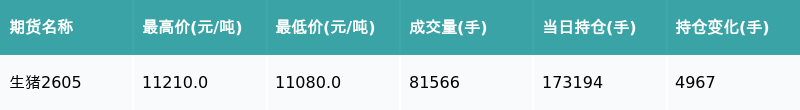南财智讯3月6日电,盘后期货数据显示,大连商品交易所的生猪主力合约收涨0.22%,收盘报11160.0元/吨,日内资金流入1.51亿元。其他相关指标见下表: