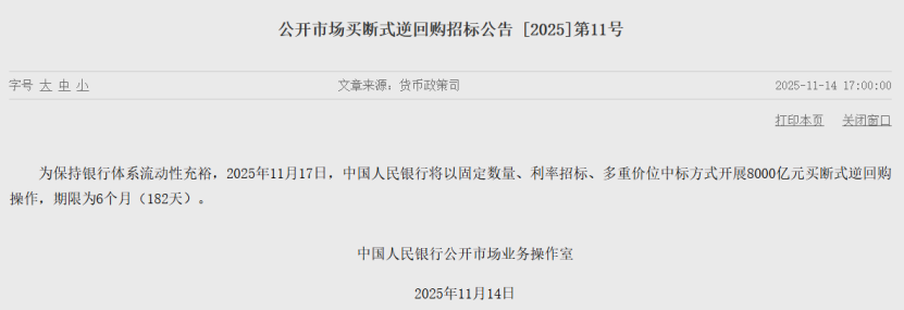 11月14日,人民银行(下称“央行”)发布预告称,将在17日以固定数量、利率招标、多重价位中标方式开展8000亿元买断式逆回购操作,期限为6个月(182天)。综合11月操作量与到期量看,本次操作意味着当月央行买断式逆回购将实现加量续作,累计净投放5000亿元。