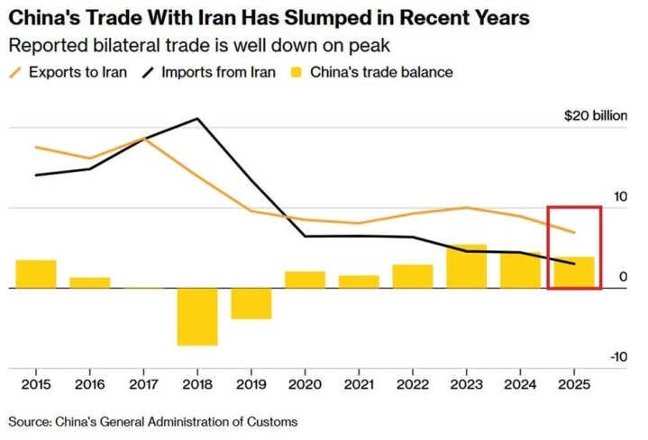 但实际上,中国因为在贸易和国际政治上一再被伊朗坑,从2024年开始已经把伊朗从一带一路核心国家中剔除,这些年中国同伊朗的贸易额一直在下降的,从官方口径上看2024年开始从伊朗直接进口的原油数量已经降到0,转口贸易即使按西方口径统计占中国总进量也不过8%左右。